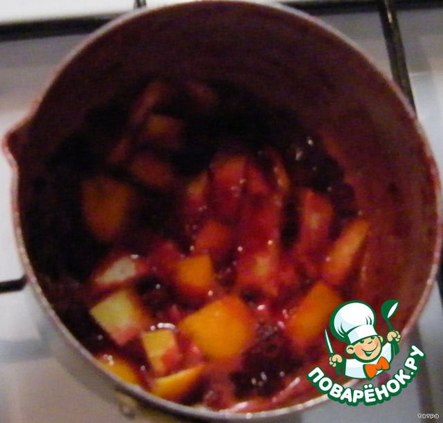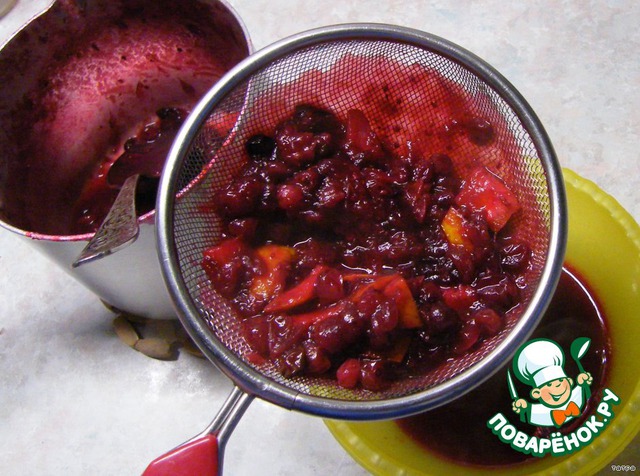 В кастрюльку положить клюкву,добавить измельченный апельсин и мед.Варить на небольшом огне 15 минут.