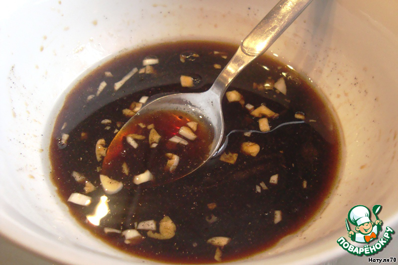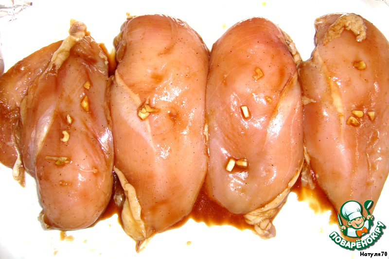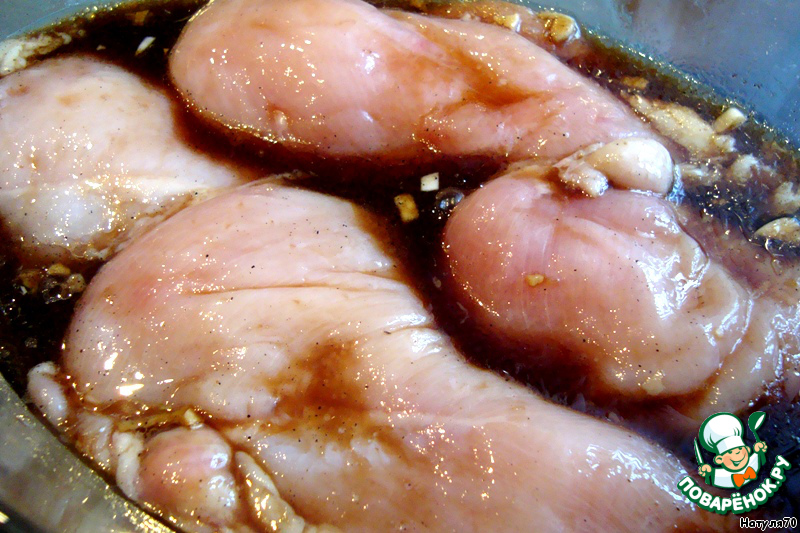 Заливаем маринадом филе, предварительно нарезанное на куски. У меня было 4 куска по 250г каждый. Маринуем 2-2,5 часа.