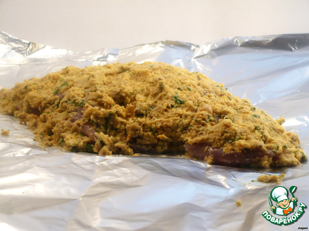 Мясо помыть, обсушить бумажной салфеткой, покрыть со всех сторон полученной смесью и положить на смазанный растительным маслом лист фольги.