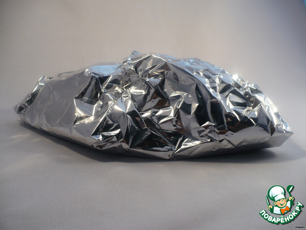 Запекать при 200 градусах до готовности. У меня получилось 40 минут. За 10 минут до готовности раскрыть фольгу и слегка подсушить корочку из нута.