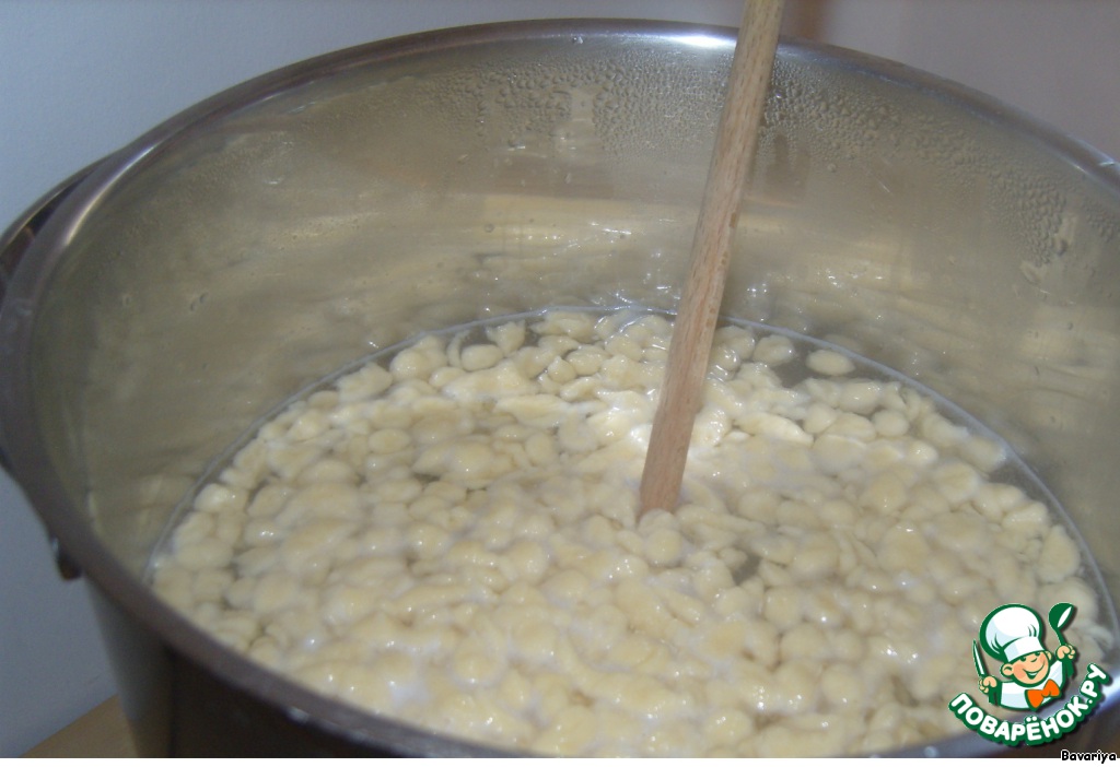 Чтобы Шпетцле не слиплись, их следует немного перемешать. Буквально через 3-5 минут Шпетцле готовы.