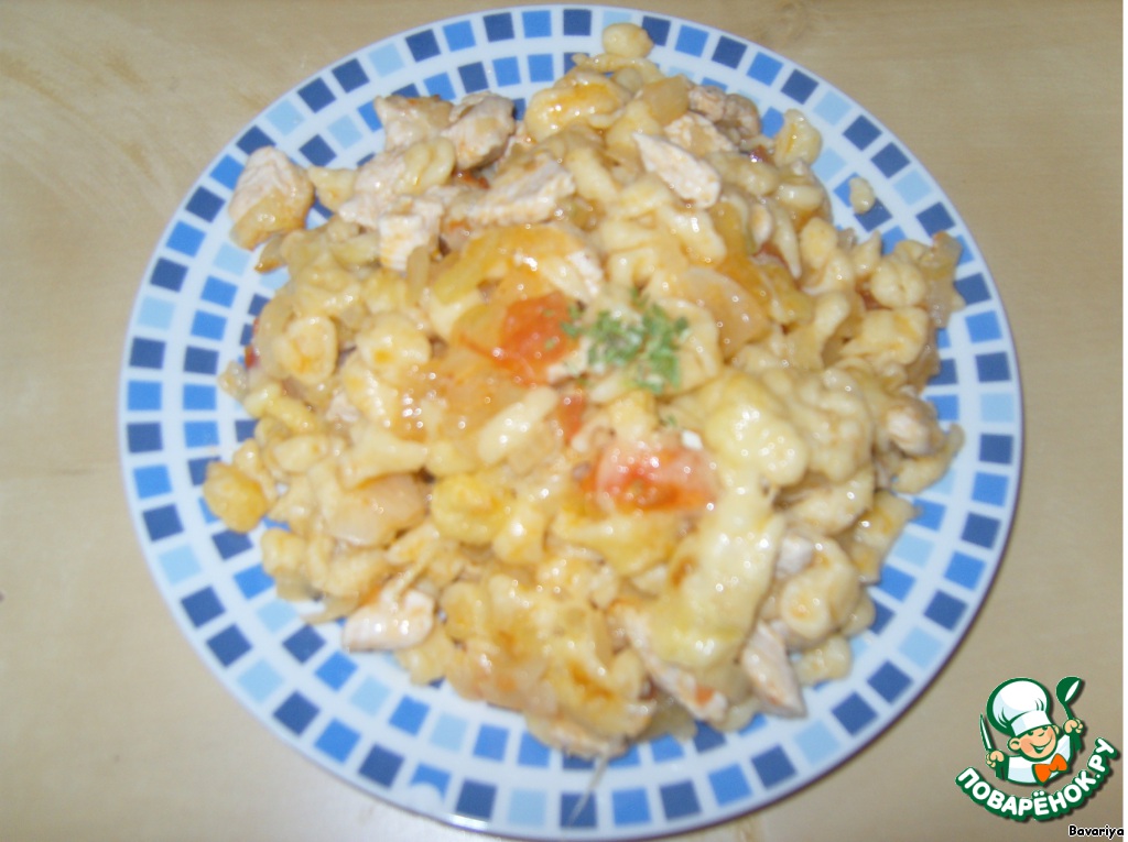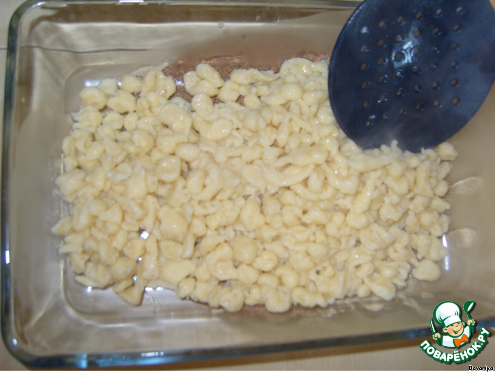 Буквально через 5 минут блюдо готово. Выкладываем его в форму для запекания. Можно «мясной ряд» перемешать со Шпетцле. Либо так и оставить: первый слой – Шпетцле, второй – «Мясной». В завершении необходимо блюдо посыпать тертым сыром. На мой взгляд, 75г сыра – это минимум.