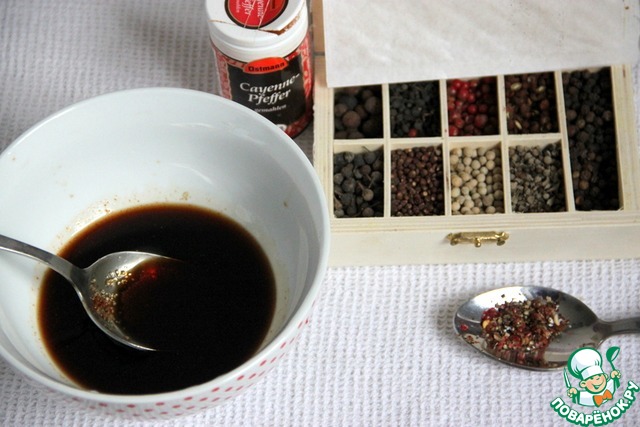 В соевый соус-терияки добавить коричневый сахар и смесь раздавленных (или грубого помола) перцев, добавить немного острого перца (например, чили-хлопьями или кайенский молотый)