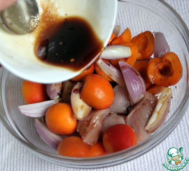 Мясо, абрикосы и лук сложить в одну посуду и залить соусом, перемешать.