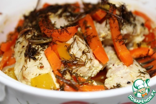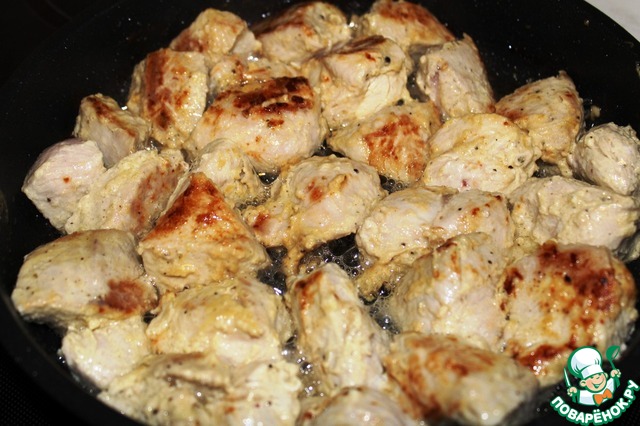 Опустить в эту массу филе индейки, нарезанное небольшими кусками (приблизительно 3 на 3 см), оставить мариноваться минут на 30.