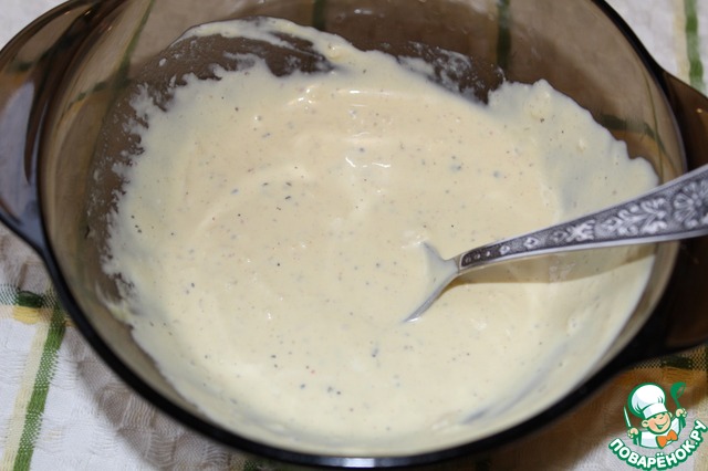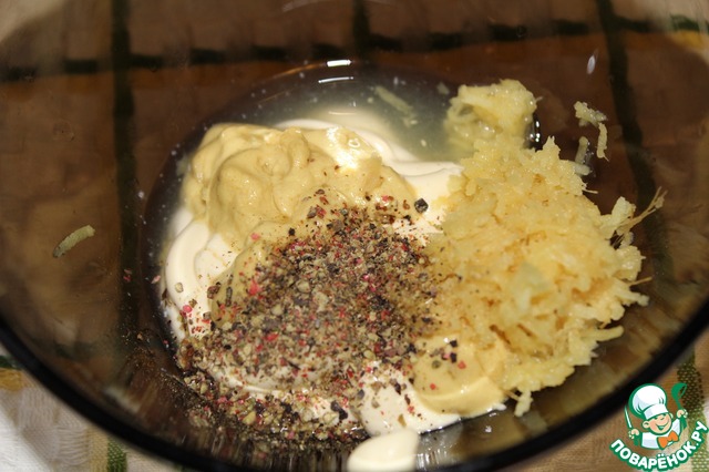 В большой миске смешать сметану, горчицу, тертый имбирь, сок из одного лимона, обильно поперчить и посолить.
