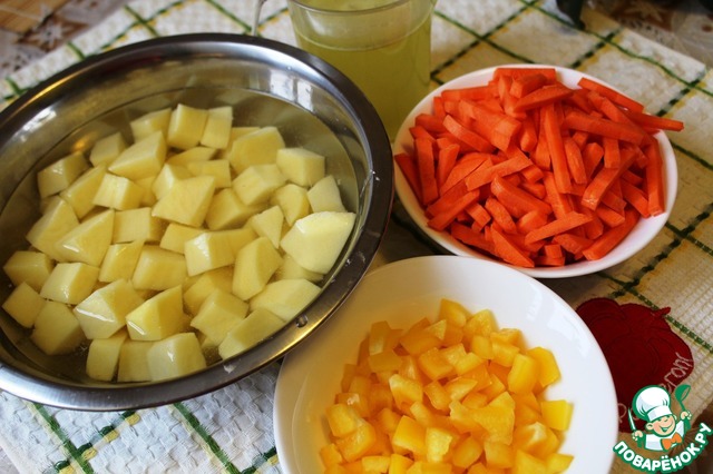 Пока индейка маринуется нарезаем крупными кубиками картофель, мелкими - перец, морковь - брусочками.