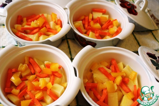 На дно порционных гаршочков для запекания выкладываем овощи.