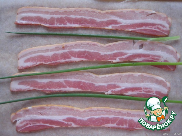 На разделочную доску выложить пищевую пленку, сверху выложить полоски грудинки - выкладывать крест-накрест, что бы рулет хорошо держался.