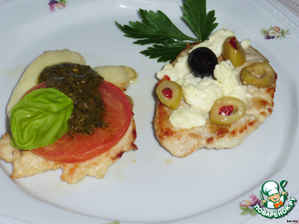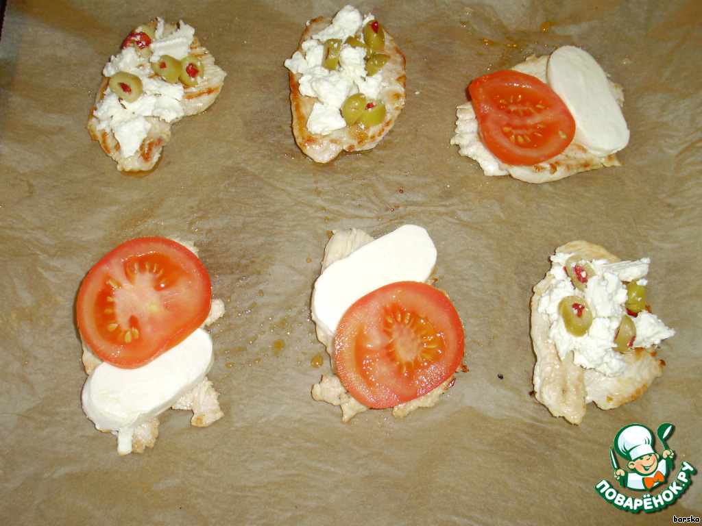 а медальоны с фетой и оливками - маслинкой и листиком петрушки.