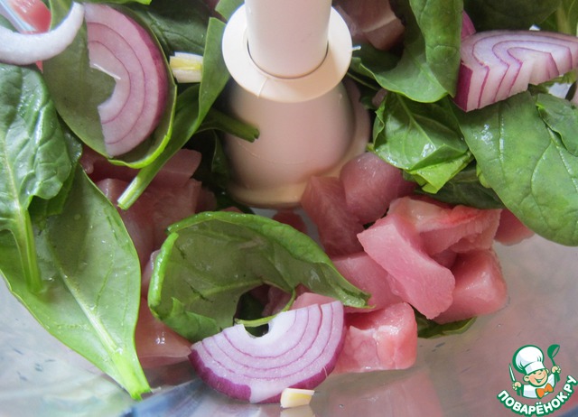 Индейку, шпинат и лук измельчить в кухонном комбайне или пропустить через мелкую решетку на мясорубке. Фарш посолить-поперчить по вкусу, добавить 3-4 ст. л. молока.