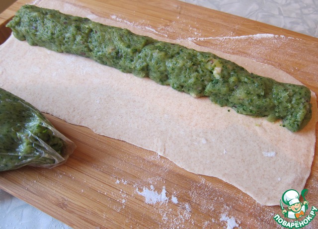 Полоску теста с одной стороны смазать водой, свернуть рулет...