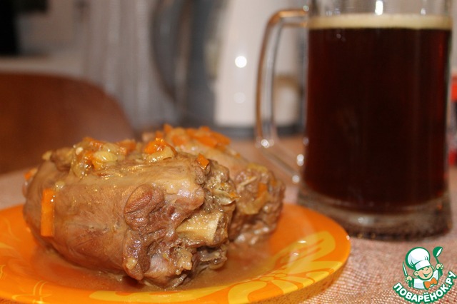 Перекладываем шеи с овощами в кастрюлю, заливаем пивом и ставим на медленный огонь примерно на 1,5-2 часа. Готовность проверяем эмпирически, то есть путем втыкания вилки в шею.