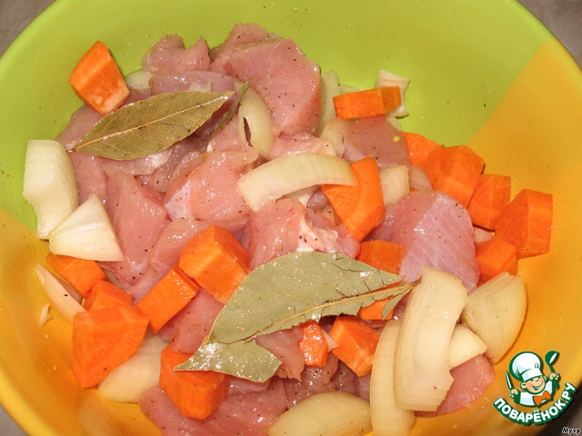 Нарезанные овощи и филе солим, перчим, добавляем приправы. Я добавила только пару листиков лавровых. Можно добавить пару капель масла подсолнечного или оливкового.