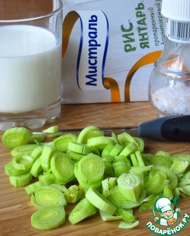 В той же сковороде обжарить до мягкости лук-порей, присыпать его 1/2 ч. л. крахмала и влить понемногу сливки. Прогреть соус до желаемой густоты.