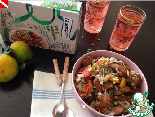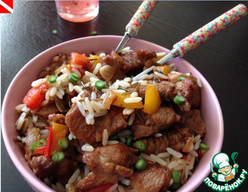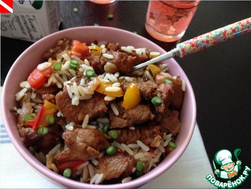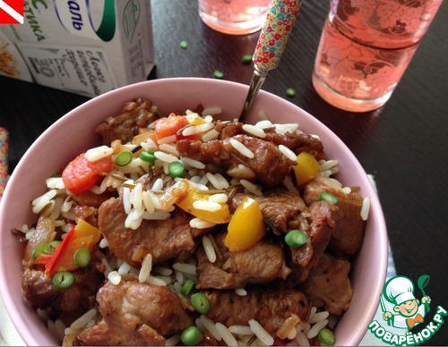 Мясо выкладываем на рис, добавляем соус Табаско.