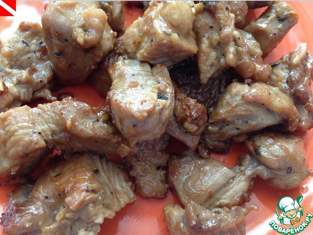 Затем добавляем соевый соус, и готовим (теперь уже помешивая) около 5 минут. За это время индейка должна стать цвета карамели и приобрести приятный блеск.
