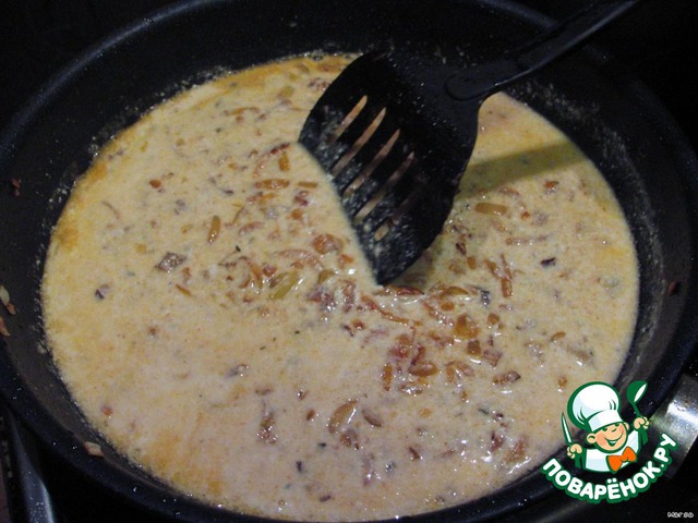 Залить смесь бульоном и довести до кипения. Подмешать сливки и уваривать соус на сильном огне, пока он не загустеет.