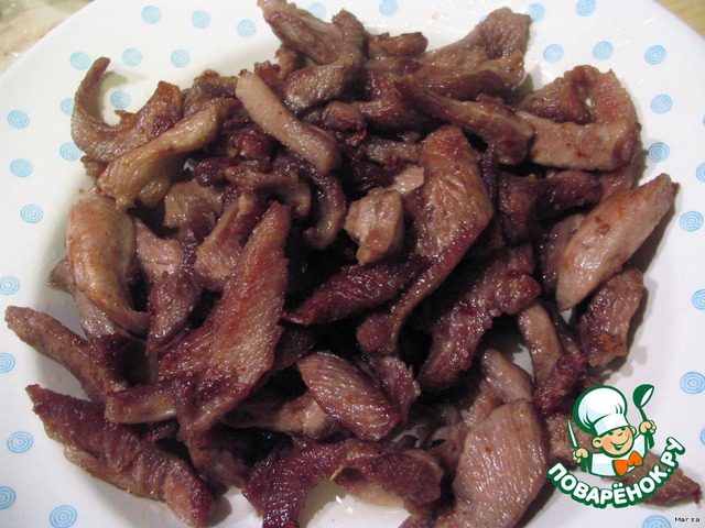 Мясо грудки индейки нарезать полосками. Посолить и поперчить.