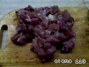 Лук почистить и нарезать кубиками. Добавить к мясу. Тушим ещё минут десять.