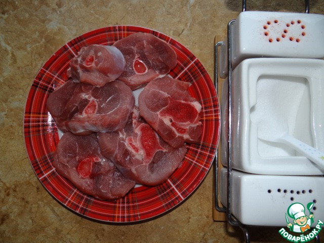 Голень индейки разделить на кусочки поперек, толщиной 2см, оставляя внутреннюю косточку (ее можно аккуратно распилить ножовкой);