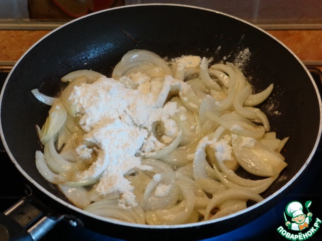 Пока запекаются кусочки индейки, поджарить резанный лук на растительном масле с добавлением муки до золотистости и в воде развести томатный порошок для соуса (можно заменить готовым томатным соком - вместо воды и порошка);