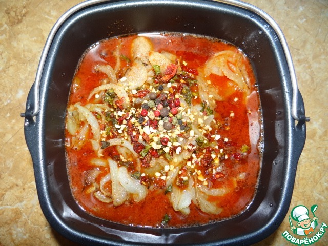 Залить томатным соком, подсолить по вкусу, приправить специями;