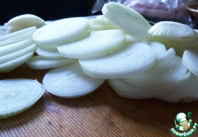 В эту же сковородку выкладываем лук (я делала двойную порцию, поэтому его так много). Обжариваем мин 4. Возвращаем индейку.. и начинаем шалить. Вливаем пиво и 4 ст. л. воды. Пиво обязательно попробуйте, оно должно вам нравится. Все вместе готовим мин 10. Индейку снова возвращаем на блюдо.
