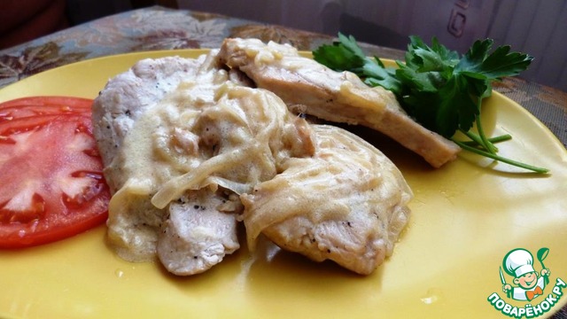 Индейку выкладываем на блюдо и поливаем соусом. Не раскрывайте секрет из чего сделан соус. В 90% случаев, говорят что он сырный.