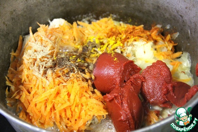 Затем добавить специи (гвоздику, турмерик, паприку, соль и белый перец) и томатную пасту и перемешать.