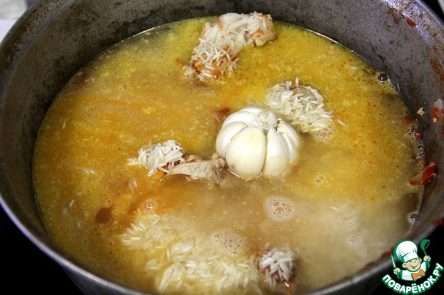 Рис промыть и добавить в казан. Следом добавить воду (или бульон), положить в центр головку чеснока, закрыть крышкой и тушить до готовности риса.