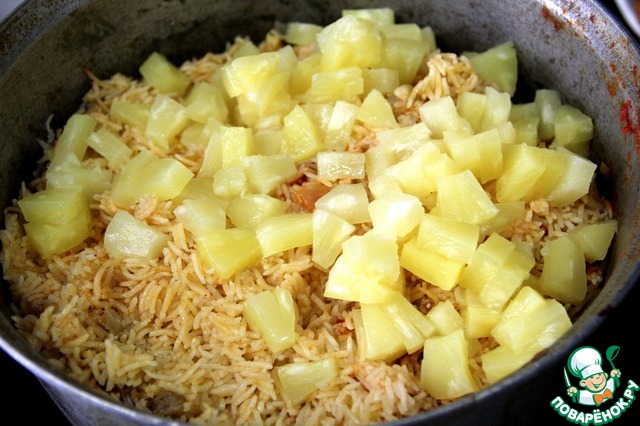 Когда рис уже почти готов, добавить мелко нарезанный ананас и сок из банки и тушить еще 5 минут. Выключить газ и дать настоятся около 30 минут.