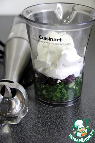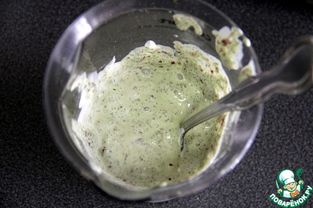 Теперь готовим соус. Смешать мелко нарезанные укроп и зеленый лук, сметану, клюкву, сыр, соль и перец (по вкусу)