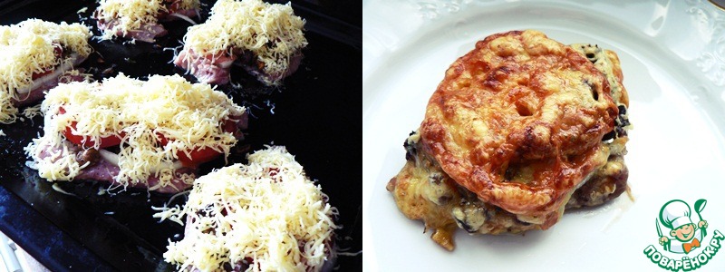 Запечённое мясо индейки с жаренными лисичками и томатами, под сыром