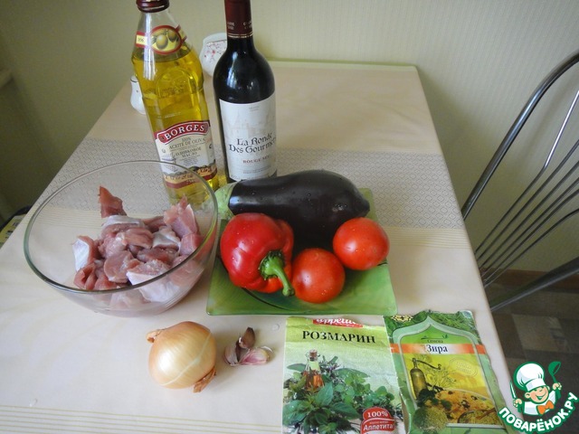 Мясо индейки режем примерно кусочками 3х3 см. Лук и чеснок мелко. Остальные овощи соразмерно мясу.