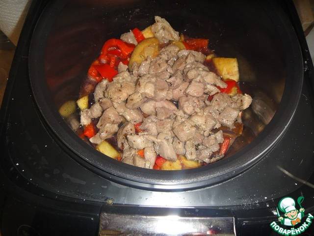 В оставшееся от мяса сок и масло выкладываем все овощи. Выставляем программу Жарка, Овощи, 15 минут. Обжариваем овощи тоже при открытой крышке, помешивая до конца программы.
