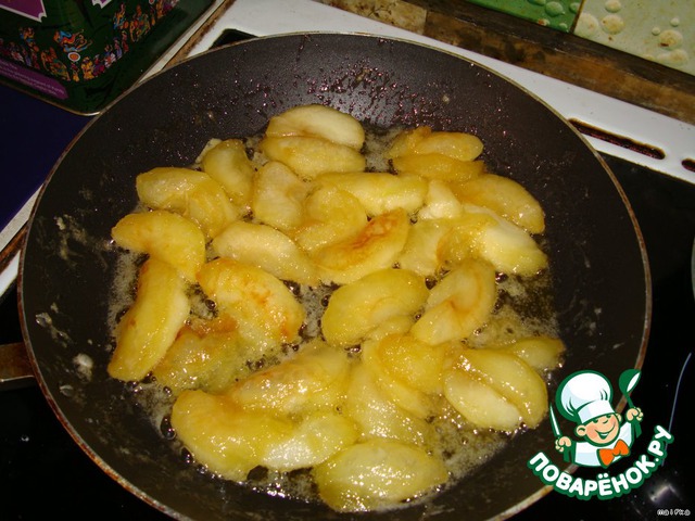 Яблоки очищаем и режем аккуратными ломтиками, масло сливочное растапливаем с сахаром и обжариваем на нем яблочные кусочки.
