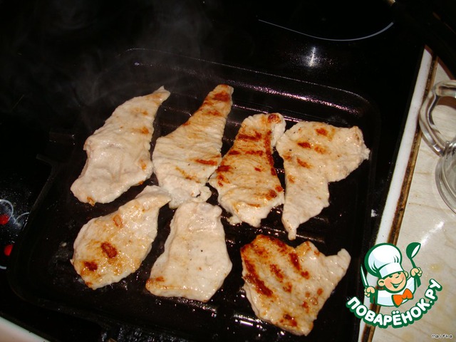 Грудку индюшки обжариваем, нарезаем полосками шириной 1 см.