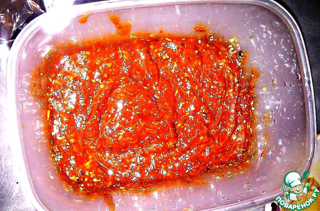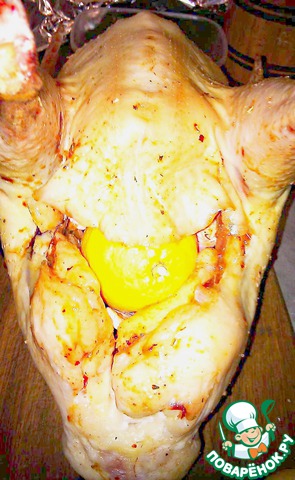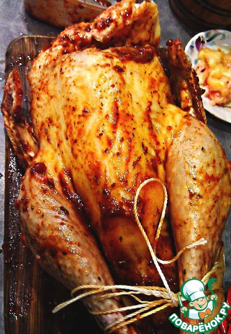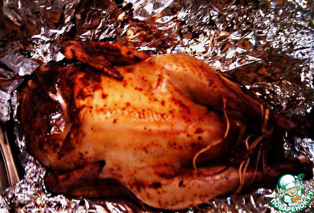 Полученным соусом обильно натираем птичку, я связал лапки, т. к. не проходила по высоте.