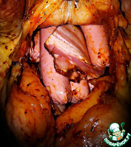 Индейка с сосисками и грудинкой