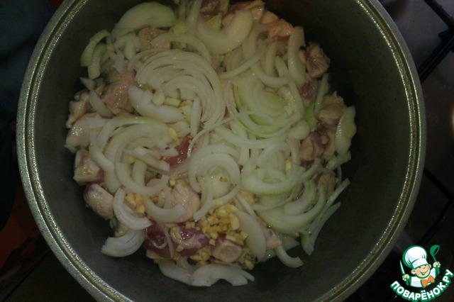Затем добавить лук и мелко порезанный чеснок. Перемешать. Тушить минут 5.