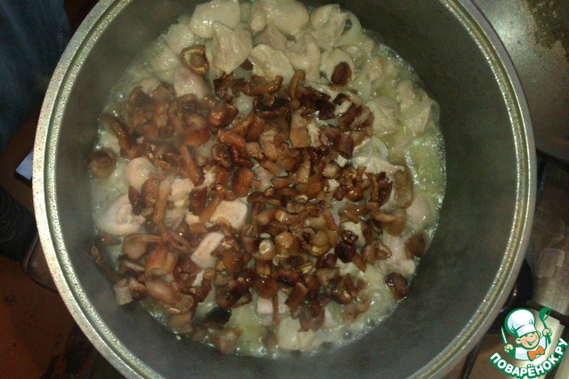 После этого добавляем грибы перемешиваем, убавляем на средний огонь, и тушим до полуготовности грибов, 10-15 минут.