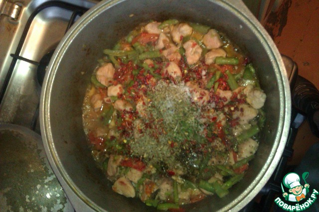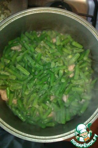 После добавляем стручковую фасоль, солим немного и перемешиваем. Тушим как и грибы 10-15 минут.