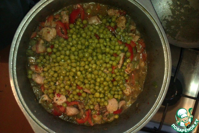 Добавляем зелёный горошек. Перемешиваем. Тушим 3 минуты.
