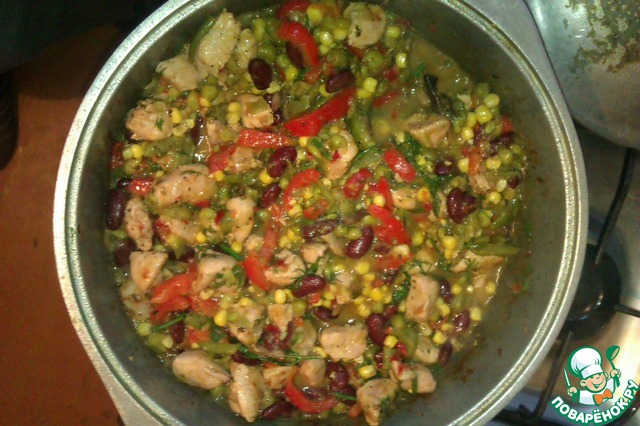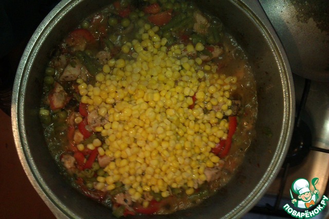 Добавляем кукурузу. Перемешиваем. Тушим 3 минуты.