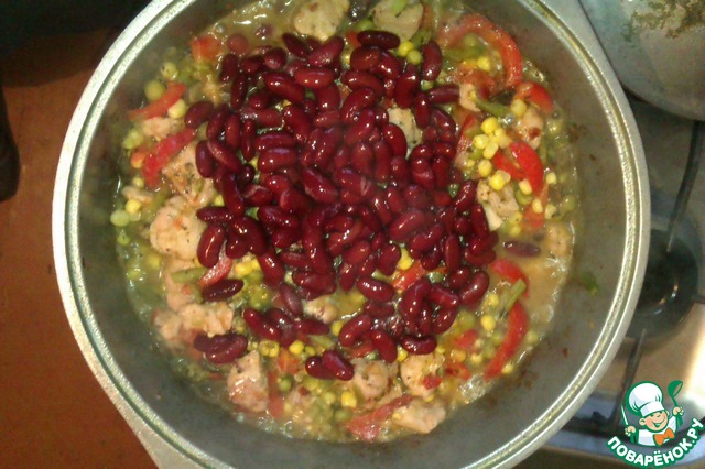 Добавляем красную фасоль. Перемешиваем. Тушим 3 минуты.