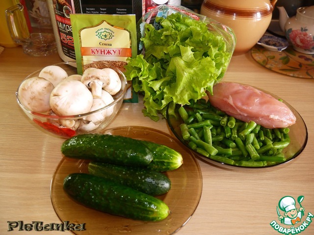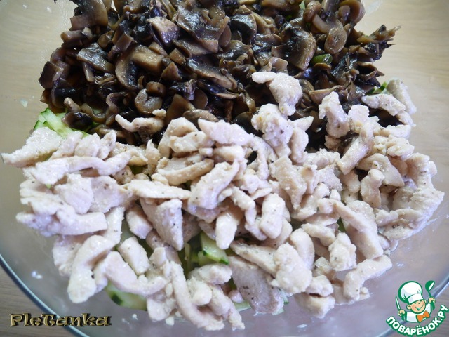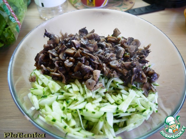 Добавить в салатник к фасоли и огурцам наши грибочки.