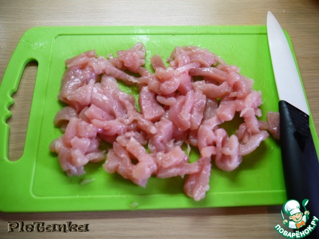 Пока готовится фасолька мы нарежем соломкой грудку.