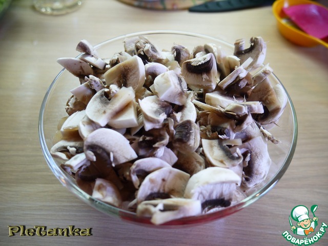 Шампиньоны нарежем произвольно и обжарим после фасольки на минимуме масла. Чуть подсолить.