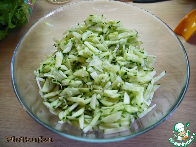 Свежие огурцы я стараюсь очищать от кожуры. Но, это на любителя. Нарезать соломкой.